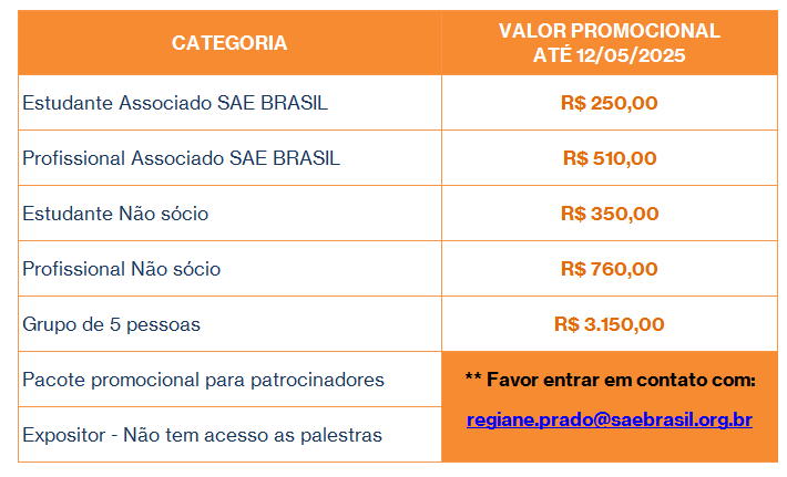 Os trabalhos e apresentações poderão ser nos idiomas inglês ou português, mas somente os trabalhos em inglês serão publicados pela SAE INTERNATIONAL.